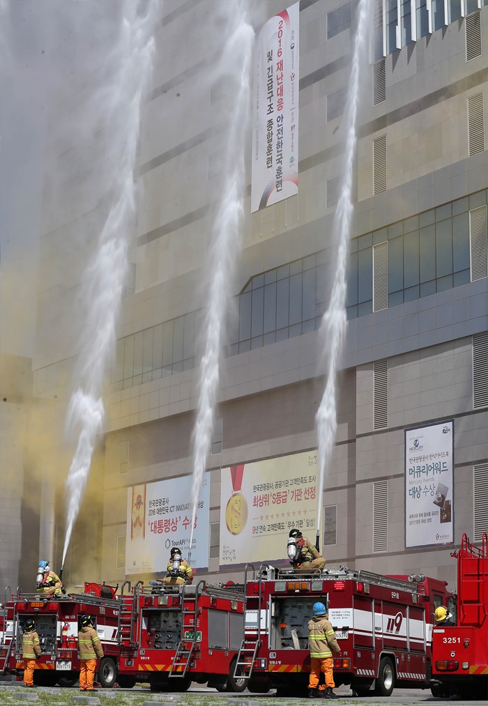 (강원=포커스뉴스) 18일 강원도 원주 한국관광공사에서 한국관광공사, 원주시, 원주경찰서, 군부대 등 유관기관 32개 기관이 참여한 가운데 2016년 재난대응 안전한국훈련 및 긴급구조종합훈련’이 열리고 있다. 이날 김종덕 문체부 장관, 정창수 한국관광공사 사장, 원창묵 원주시장이 참석했다. <사진제공=문화체육관광부>