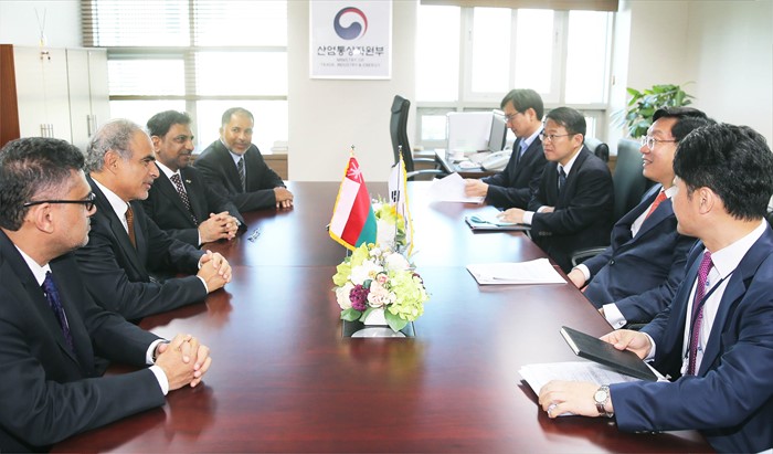 (서울=포커스뉴스) 주형환 산업통상자원부 장관이 18일 서울 정부서울청사 외교부 집무실에서 모하메드 빈 하메드 빈 싸이프 알 룸히(Mohammed bin Hamed bin Saif Al-Rumhy) 오만 석유가스부 장관의 예방을 받고, 한-오만 양국간 석유·가스분야의 협력 강화와 오일·가스 프로젝트 협력 등에 관해 의견을 교환하고 있다. <사진제공=산업통상자원부>