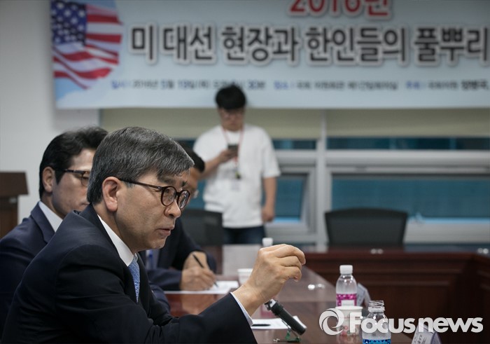 (서울=포커스뉴스) 19일 오전 서울 여의도 국회 의원회관에서 열린 '2016년 미국 대선 현장과 한인들의 풀뿌리 정치' 세미나에 참석한 김동석 미국시민참여센터 상임이사가 발언하고 있다.