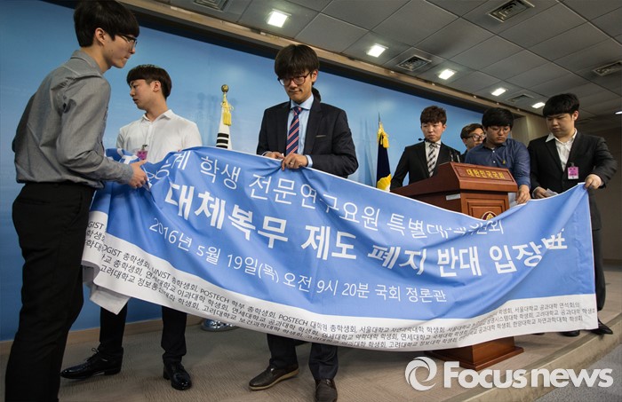 (서울=포커스뉴스) 카이스트 학부 총학생회 등이 포함된 전국 이공계 학생 전문연구요원 특위가 19일 오전 서울 여의도 국회 정론관에서 국방부가 전문연구요원 및 산업기능요원 제도 전면 폐지 방안 검토와 관련 입장표명 기자회견을 하고 있다.
