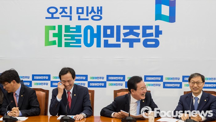 (서울=포커스뉴스) 19일 오전 여의도 국회에서 열린 더불어민주당 원내대표단 회의에 참석한 박완주(왼쪽부터) 원내수석부대표, 우상호 원내대표, 변재일 정책위의장, 김성주 의원이 대화하고 있다.