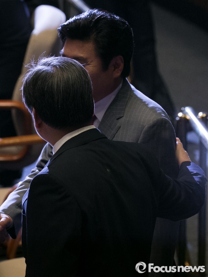 (서울=포커스뉴스) 19일 오전 서울 여의도 국회에서 열린 342회 국회(임시회) 1차 본회의에 참석한 김무성(왼쪽) 새누리당 전 대표와 원유철 전 원내대표가 인사하고 있다.