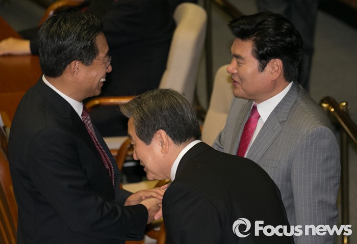 (서울=포커스뉴스) 19일 오전 서울 여의도 국회에서 열린 342회 국회(임시회) 1차 본회의에 참석한 원유철(오른쪽부터) 새누리당 전 원내대표, 김무성 전 대표, 전하진 의원이 인사하고 있다.