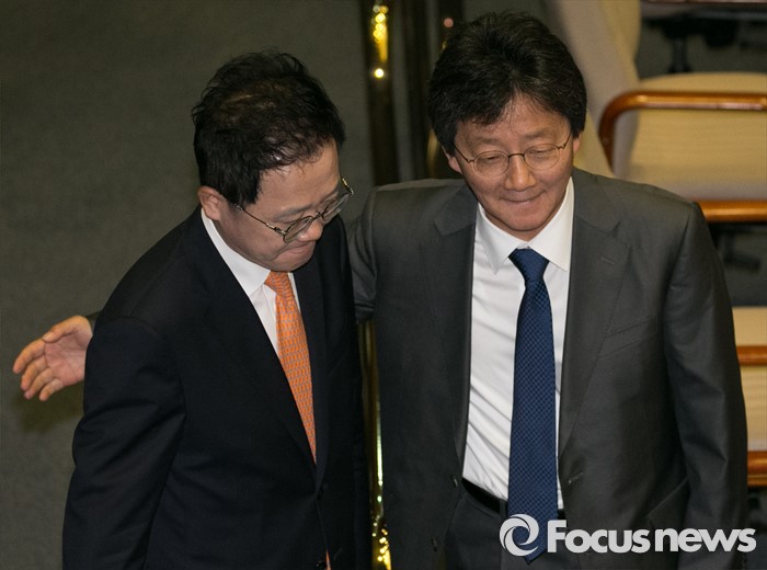 (서울=포커스뉴스) 19일 오전 서울 여의도 국회에서 열린 342회 국회(임시회) 1차 본회의에 참석한 청와대 경제수석으로 임명된 강석훈(왼쪽) 새누리당 의원과 유승민 무소속 의원이 인사하고 있다.