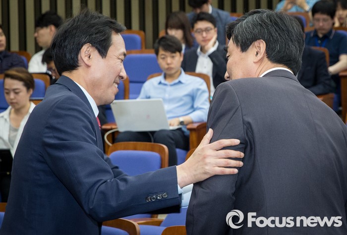 (서울=포커스뉴스) 19일 오전 여의도 국회에서 열린 더불어민주당 의원총회에 참석한 우상호 신임 원내대표와 이종걸 전 원내대표가 대화하고 있다.