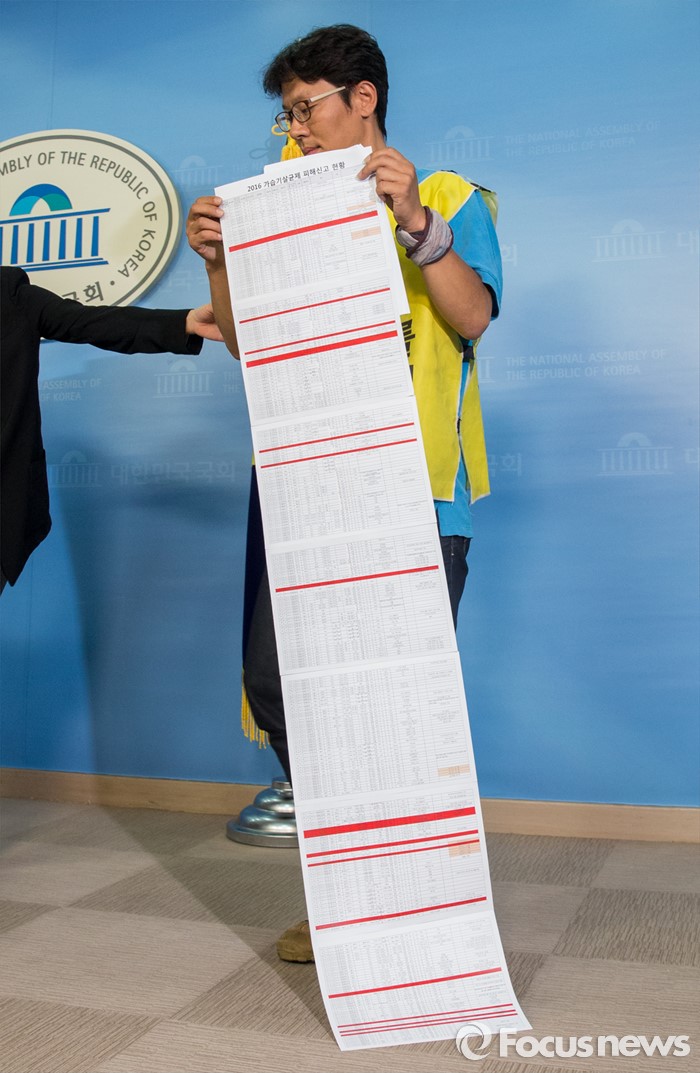 (서울=포커스뉴스) 19일 오전 여의도 국회 정론관에서 열린 '가습기살균제 피해 접수 결과 보고' 관련 기자회견에 참석한 가습기살균제 피해자 가족 안성우씨가 피해 신고 현황이 기록된 종이를 들고 있다.