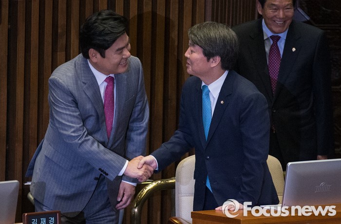 (서울=포커스뉴스) 19일 오전 서울 여의도 국회에서 열린 342회 국회(임시회) 1차 본회의에서 안철수 국민의당 대표와 원유철 새누리당 전 원내대표가 인사를 나누고 있다.