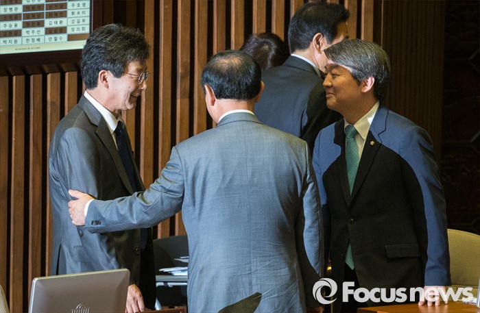 (서울=포커스뉴스) 19일 오전 서울 여의도 국회에서 열린 342회 국회(임시회) 1차 본회의에서 유승민(왼쪽) 무소속 의원과 안철수(오른쪽) 대표가 인사를 나누고 있다.