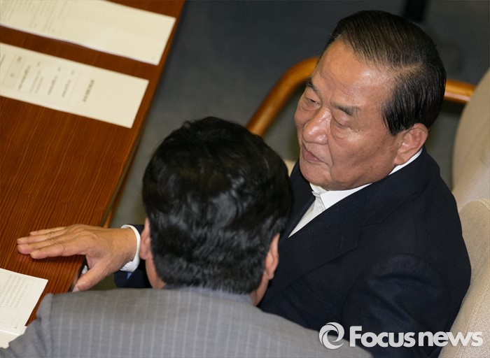 (서울=포커스뉴스) 19일 오전 서울 여의도 국회에서 열린 342회 국회(임시회) 1차 본회의에 참석한 서청원(오른쪽) 새누리당 전 최고위원과 원유철 전 원내대표가 대화하고 있다.