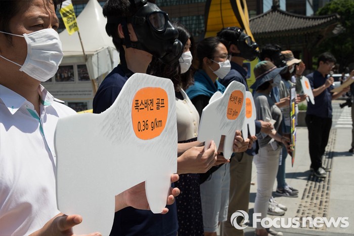 (서울=포커스뉴스) 19일 오전 서울 광화문광장에서 서울환경연합원들이 질소산화물 배출기준치 초과 경유차 운행 제한 및 대책마련을 촉구하며 기자회견을 하고 있다.