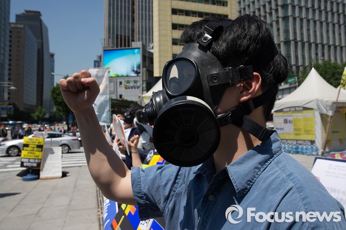 (서울=포커스뉴스) 19일 오전 서울 광화문광장에서 서울환경연합원들이 질소산화물 배출기준치 초과 경유차 운행 제한 및 대책마련을 촉구하며 구호를 외치고 있다.