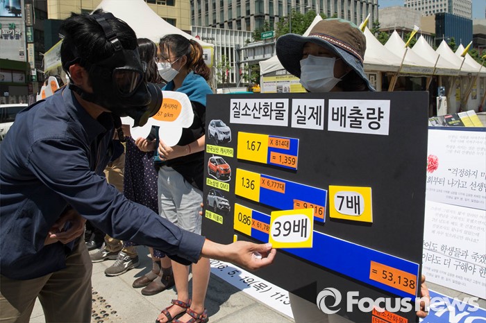 (서울=포커스뉴스) 19일 오전 서울 광화문광장에서 서울환경연합원들이 질소산화물 배출기준치 초과 경유차 운행 제한 및 대책마련을 촉구하며 기자회견을 하고 있다.