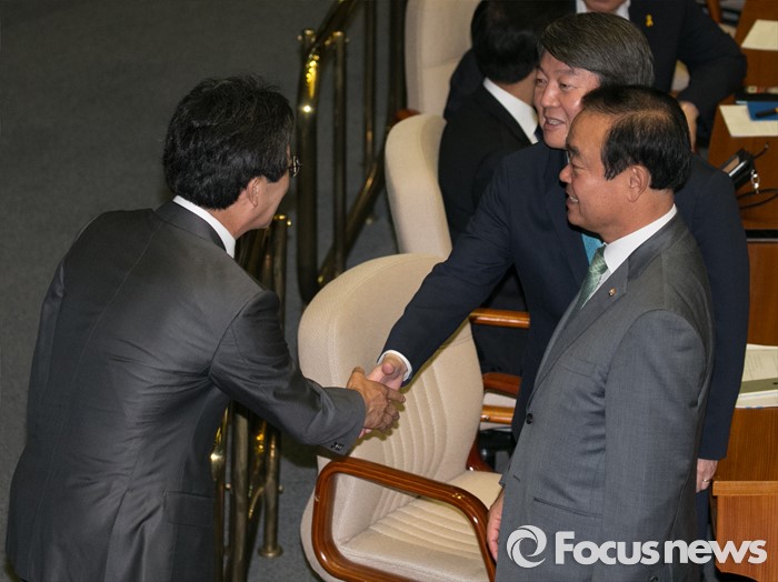 (서울=포커스뉴스) 19일 오전 서울 여의도 국회에서 열린 342회 국회(임시회) 1차 본회의에 참석한 안철수 국민의당 상임공동대표, 장병완 의원과 유승민 무소속 의원이 인사하고 있다.