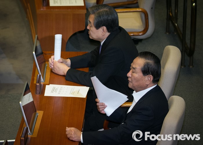 (서울=포커스뉴스) 19일 오전 서울 여의도 국회에서 열린 342회 국회(임시회) 1차 본회의에 참석한 김무성(왼쪽) 새누리당 전 대표와 서청원 전 최고위원이 자리하고 있다.