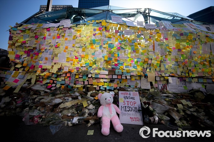 이날 강남역 10번 출구는 오전부터 피해 여성을 추모하기 위해 이곳을 찾은 시민들로 북적였다. 남녀노소 할 것 없이 저마다 작은 종이에 자신이 느낀 슬픔과 분노를 적어 고인의 넋을 기렸다.