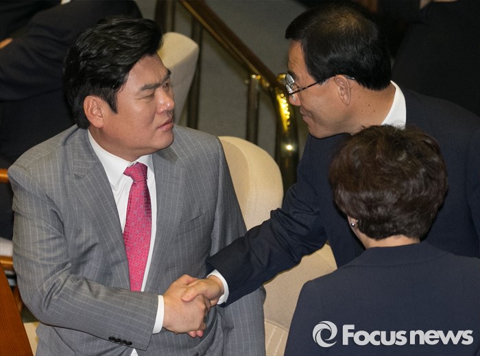 이어 원 전 원내대표는 "하지만 결정은 기본적으로 본인이 해야 한다. 본인 의사가 최우선이고 도와달라 하면 같이…. 후임 대표님인데 잘 모시고 잘 성공해야 편하다. 괜히 나도 불안불안하다"면서 당내 분란에 대한 안타까움을 드러냈다.(서울=포커스뉴스) 19일 오전 서울 여의도 국회에서 열린 342회 국회(임시회) 1차 본회의에 참석한 원유철(왼쪽) 새누리당 전 원내대표와 주호영 무소속 의원이 대화하고 있다. 2016.05.19 박동욱 기자