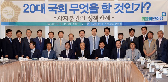 (서울=포커스뉴스) 19일 오전 서울 여의도 국회 귀빈식당에서 열린 20대 국회 무엇을 할 것인가?, 자치분권의 정책과제에 참석한 김종인 더불어민주당 비대위 대표, 박원순 서울시장, 기초단체장과 의원 및 당선인들이 기념촬영을 하고 있다. <사진제공=더불어민주당>