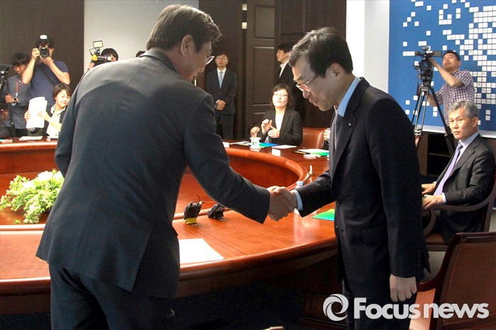 (서울=포커스뉴스) 현장조사에 나선 이춘석(왼쪽) 더불어민주당 어버이연합 등 불법 자금 지원 의혹 규명 진상조사 태스크포스(TF) 위원장이 19일 오후 서울 여의도 전국경제인연합회관에서 이승철 상근부회장과 간담회에 앞서 인사하고 있다.