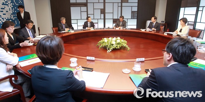 (서울=포커스뉴스) 현장조사에 나선 이춘석 더불어민주당 어버이연합 등 불법 자금 지원 의혹 규명 진상조사 태스크포스(TF) 위원장 등 위원들이 19일 오후 서울 여의도 전국경제인연합회관에서 이승철 상근부회장 등과 간담회를 하고 있다.
