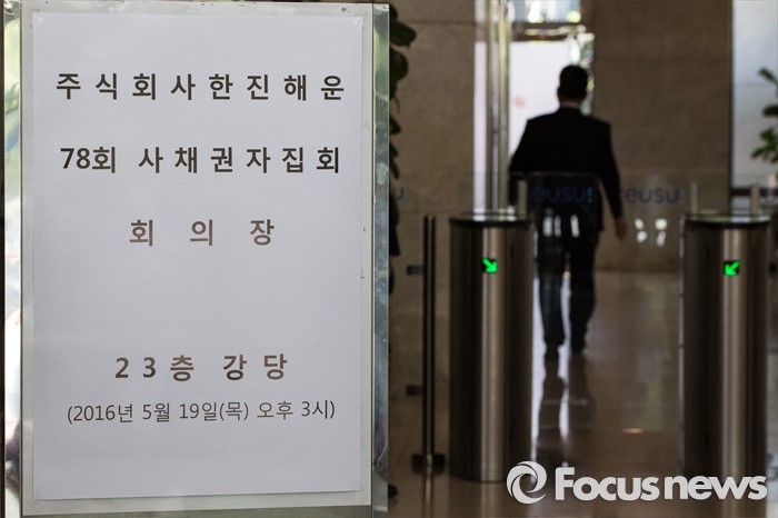 (서울=포커스뉴스) 한진해운의 채무조정을 위한 첫 사채권자 집회가 열린 19일 오후 서울 영등포구 한진해운 본사 로비에 안내문이 보이고 있다.