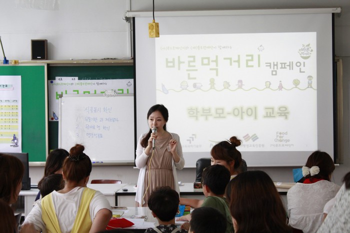 올해는 2만명 무상 교육을 계획하고 있으며 2020년까지 10만명 교육을 목표로 하고 있다. 이외에도 '바른먹거리송'과 '바른먹거리율동'을 개발하고, 학부모 대상 '로하스(LOHAS) 식생활교육' 등 올바른 식습관을 알리기 위한 다양한 활동을 펼치고 있다.바른먹거리 캠페인 '학부모-아이 교육' 시간에 전문강사가 교육내용에 대해 설명하고 있다.<사진제공=풀무원>