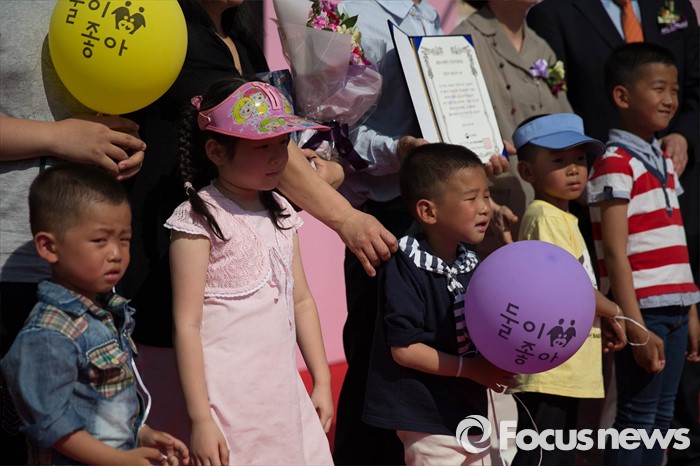 (서울=포커스뉴스) 19일 오후 서울시청광장에서 열린 '제1회 건강가정 다출산 범국민대회'에 참석한 김정수, 함은주 가족의 아이들이 다출산 건강가정 대상 시상을 준비하고 있다.