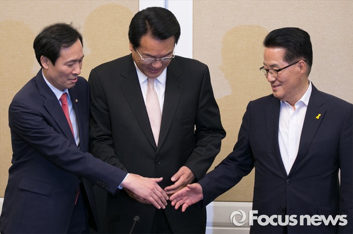 (서울=포커스뉴스) 19일 오후 서울 여의도 국회 귀빈식당에서 20대 국회 원구성 등 협상을 위해 열린 3당 원내대표 회동에 참석한 의원들이 취재진을 향해 포즈를 취하고 있다. 왼쪽부터 우상호 더불어민주당 원내대표, 정진석 새누리당 원내대표, 박지원 국민의당 원내대표.