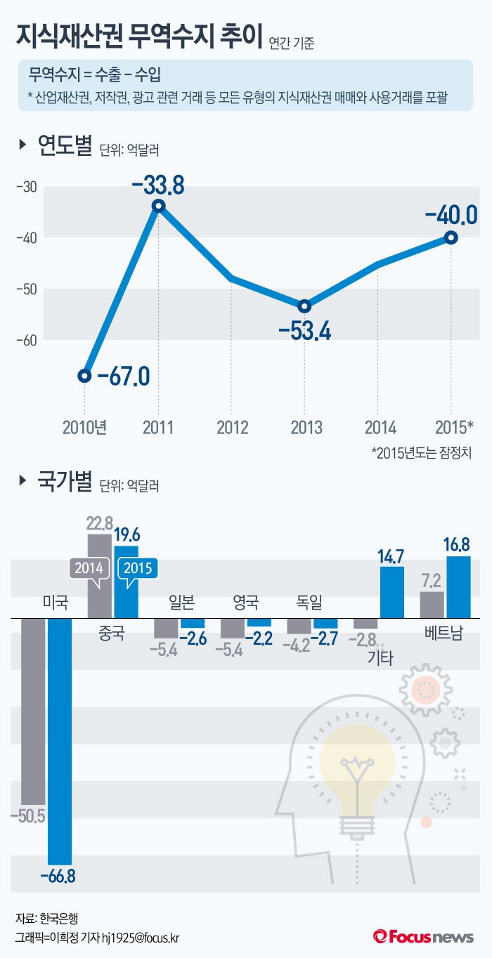 (서울=포커스뉴스) 18일 한국은행은 2015년 중 한국의 지식재산권 무역수지 적자가 40억 달러로 집계되 3년 연속 감소세를 보였다고 밝혔다. 거래상대방 국가별로는 미국이 66억8000만달러 적자로 가장 큰 적자국이었다. 중국은 19억6000만달러로 가장 큰 흑자국이었으며 베트남에 대해서도 16억8000만달러 흑자를 기록했다.