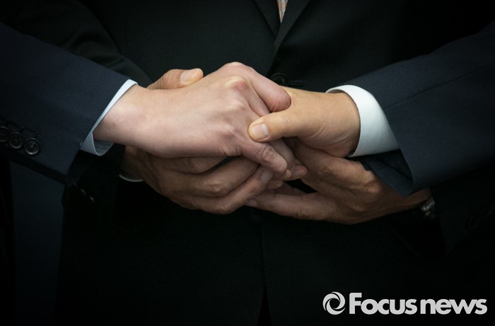 (서울=포커스뉴스) 19일 오후 서울 여의도 국회 귀빈식당에서 20대 국회 원구성 등 협상을 위해 열린 3당 원내대표 회동에 참석한 의원들이 취재진을 향해 포즈를 취하고 있다. 왼쪽부터 우상호 더불어민주당 원내대표, 정진석 새누리당 원내대표, 박지원 국민의당 원내대표.