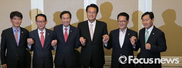 (서울=포커스뉴스) 19일 오후 서울 여의도 국회 귀빈식당에서 20대 국회 원구성 등 협상을 위해 열린 3당 원내대표 회동에 참석한 의원들이 취재진을 향해 포즈를 취하고 있다. 왼쪽부터 박완주 더불어민주당 원내수석부대표, 김도읍 새누리당 원내수석부대표, 우상호 더불어민주당 원내대표, 정진석 새누리당 원내대표, 박지원 국민의당 원내대표, 김관영 원내수석부대표.