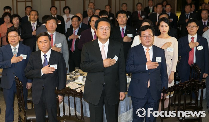 (서울=포커스뉴스) 19일 오후 여의도 서울시티클럽에서 열린 충청 향우 친선의 밤 행사에 참석한 정진석 새누리당 원내대표 등 내빈들이 국기에 대한 경례를 하고 있다.