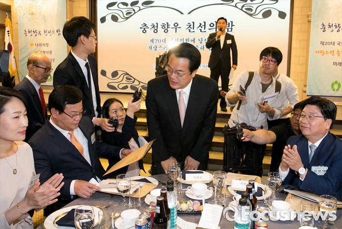 (서울=포커스뉴스) 19일 오후 여의도 서울시티클럽에서 열린 충청 향우 친선의 밤 행사에 참석한 정진석 새누리당 원내대표가 인사하고 있다. 오른쪽부터 권선택 대전시장, 정 원내대표, 이은권 새누리당 당선인, 김수민 국민의당 당선인.