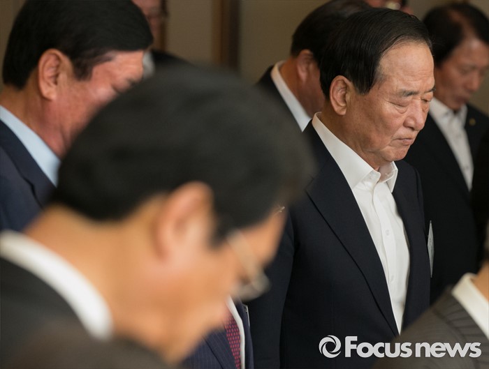 (서울=포커스뉴스) 19일 오후 여의도 서울시티클럽에서 열린 충청 향우 친선의 밤 행사에 참석한 정진석(왼쪽) 새누리당 원내대표와 서청원 전 최고위원이 묵념을 하고 있다.