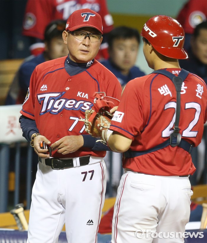 | △ 포수와 얘기하는 KIA 김기태 감독 |