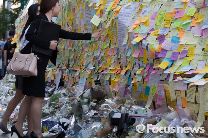 (서울=포커스뉴스) 19일 오후 서울 서초구 강남역 10번출구에서 시민들이 '강남 묻지마 살인' 피해자를 추모하고 있다.
