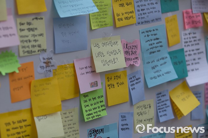 (서울=포커스뉴스) 19일 오후 서울 서초구 강남역 10번출구에서 시민들이 '강남 묻지마 살인' 피해자를 추모하고 있다.