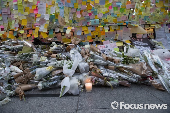 (서울=포커스뉴스) 19일 오후 서울 서초구 강남역 10번출구에서 시민들이 '강남 묻지마 살인' 피해자를 추모하고 있다.