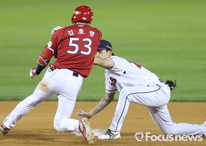(서울=포커스뉴스) 19일 서울 잠실구장에서 열린 2016프로야구 KIA-두산 경기 7회초 KIA 선두타자 김호령이 좌전 안타를 치고 2루까지 달리다 두산 2루수 오재원에게 태그아웃되고 있다.