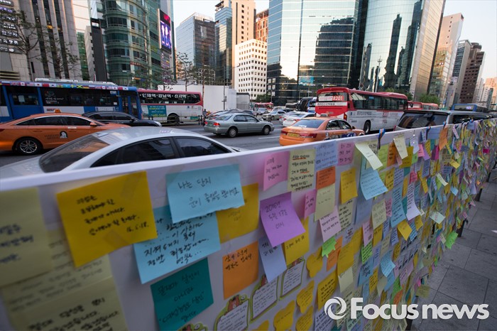 (서울=포커스뉴스) 19일 오후 서울 서초구 강남역 10번출구에서 '강남 묻지마 살인' 피해자를 추모하는 쪽지가 늘어나고 있다.