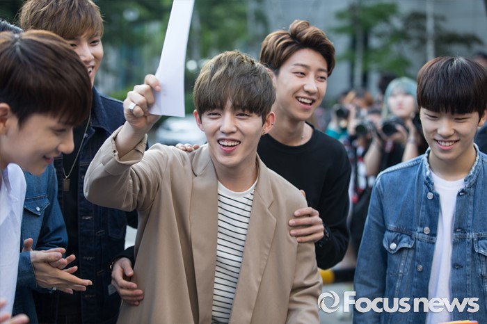 (서울=포커스뉴스) 20일 오전 서울 영등포구 KBS에서 아이돌그룹 세븐틴의 멤버들이 생방송 뮤직뱅크 리허설에 참여하기 위해 이동하던중 환한 미소를 짓고 있다.