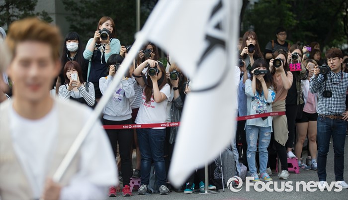 (서울=포커스뉴스) 20일 오전 서울 영등포구 KBS에서 생방송 뮤직뱅크 리허설에 참여한 몬스타엑스의 멤버들을 팬들이 촬영하고 있다.