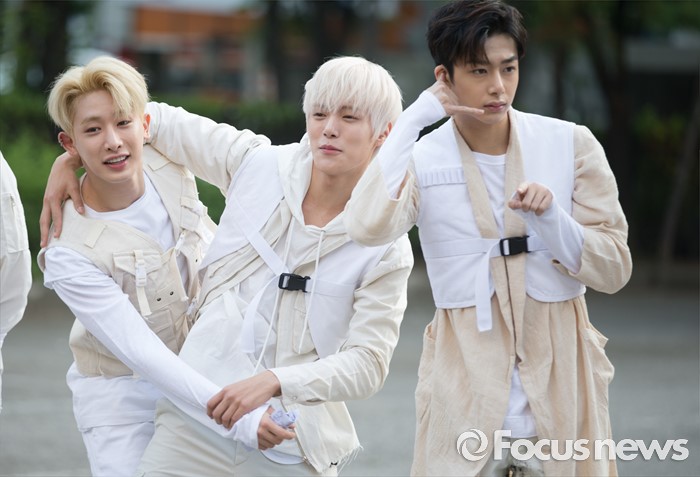 (서울=포커스뉴스) 20일 오전 서울 영등포구 KBS에서 아이돌그룹 몬스타엑스의 멤버들이 생방송 뮤직뱅크 리허설에 참여하기 위해 이동하던 중 포토타임을 갖고 있다.