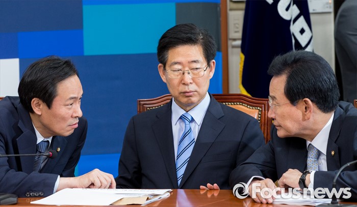 (서울=포커스뉴스) 20일 오전 서울 여의도 국회에서 열린 더불어민주당 비상대책위원회의에 참석한 우상호(왼쪽부터) 원내대표와 양승조 비대위원, 변재일 정책위의장이 대화하고 있다.