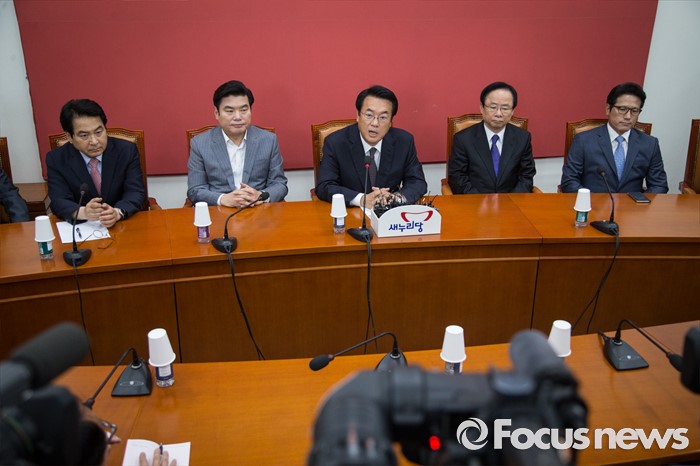 (서울=포커스뉴스) 정진석 새누리당 원내대표가 20일 오전 서울 여의도 국회에서 열린 '원내지도부-중진의원 연석회의'에 참석해 모두발언을 하고 있다. 왼쪽부터 심재철, 원유철 의원, 정 원내대표, 이주영, 정병국 의원.