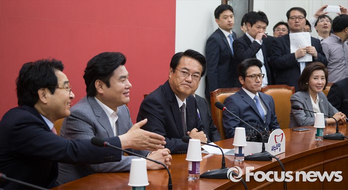 (서울=포커스뉴스) 정진석 새누리당 원내대표와 원유철 전 원내대표를 비롯한 중진의원들이 20일 오전 서울 여의도 국회에서 열린 원내지도부-중진의원 연석회의에 참석해 대화하고 있다. 왼쪽부터 심재철, 원유철 의원, 정 원내대표, 정병국, 나경원 의원.