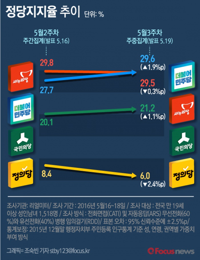 (서울=포커스뉴스) 리얼미터가 19일 발표한 여론조사 결과에 따르면 더민주의 지지율은 1.9%p 상승한 29.6%로 29.5%를 기록한 새누리당을 제치고 1위에 올랐다.