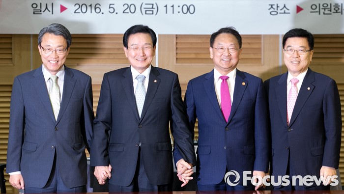 (서울=포커스뉴스) 20일 오전 서울 여의도 국회 의원회관에서 열린 1차 민생경제현안점검회의에 참석한 3당 정책위의장과 유일호 경제부총리 겸 기획재정부 장관이 취재진을 향해 포즈를 취하고 있다. 왼쪽부터 김성식 국민의당 정책위의장, 변재일 더불어민주당 정책위의장, 유 부총리, 김광림 새누리당 정책위의장.