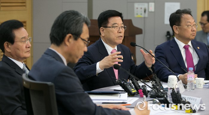 (서울=포커스뉴스) 20일 오전 서울 여의도 국회 의원회관에서 열린 1차 민생경제현안점검회의에 참석한 김광림 새누리당 정책위의장이 모두발언을 하고 있다. 왼쪽부터 변재일 더불어민주당 정책위의장, 김성식 국민의당 정책위의장, 김광림 새누리당 정책위의장, 유일호 경제부총리 겸 기획재정부 장관.