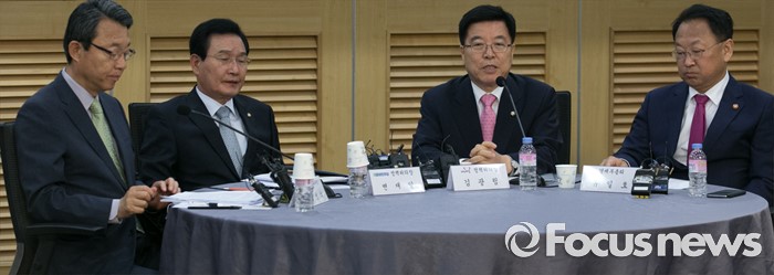 (서울=포커스뉴스) 20일 오전 서울 여의도 국회 의원회관에서 열린 1차 민생경제현안점검회의에 참석한 김광림 새누리당 정책위의장이 모두발언을 하고 있다. 왼쪽부터 김성식 국민의당 정책위의장, 변재일 더불어민주당 정책위의장, 김광림 새누리당 정책위의장, 유일호 경제부총리 겸 기획재정부 장관.