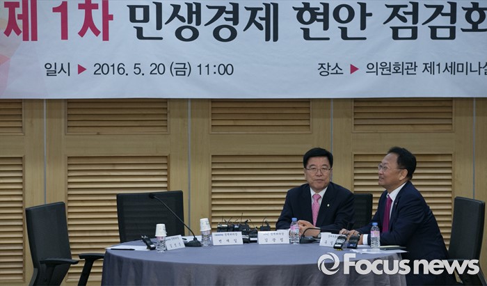(서울=포커스뉴스) 20일 오전 서울 여의도 국회 의원회관에서 열린 1차 민생경제현안점검회의에 참석한 김광림(왼쪽) 새누리당 정책위의장과 유일호 경제부총리 겸 기획재정부 장관이 대화하고 있다.